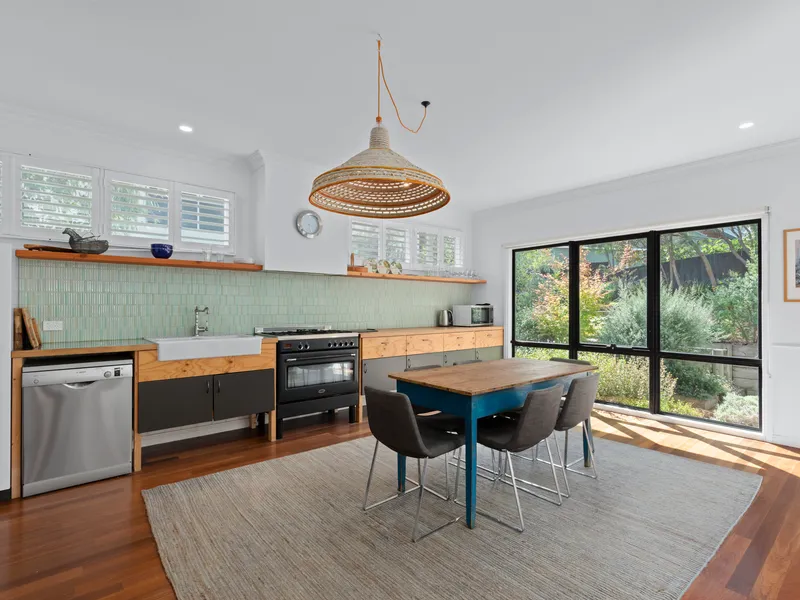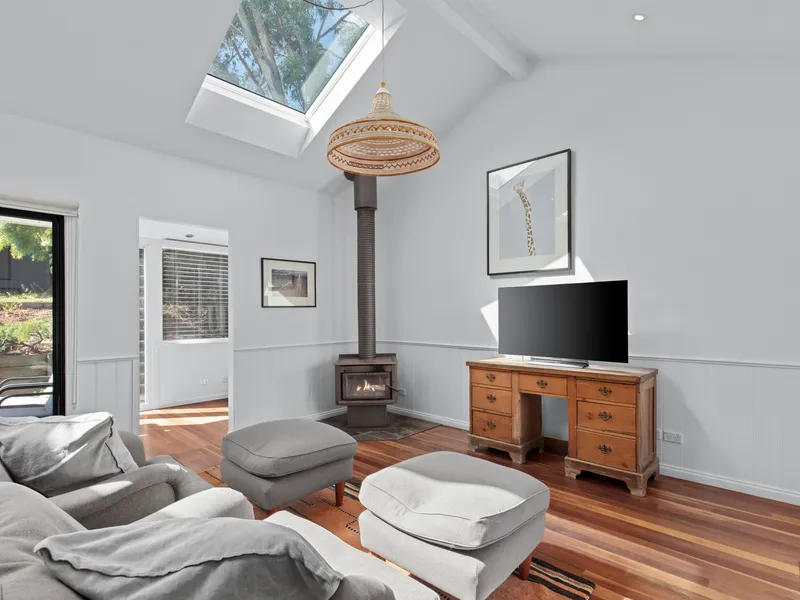 Oriented to capture a prized north-facing aspect, the open-plan living, dining, and kitchen domain is a statement in both design and functionality. Elevated ceilings create a sense of grandeur, while premium finishes, including bespoke timber work surfaces, striking Italian tiling, a 900mm cooktop, and polished Blue Gum timber flooring, underscore the home’s commitment to quality. A feature wood fireplace adds a layer of warmth, perfectly complementing the serene outlook across the lush, established gardens.