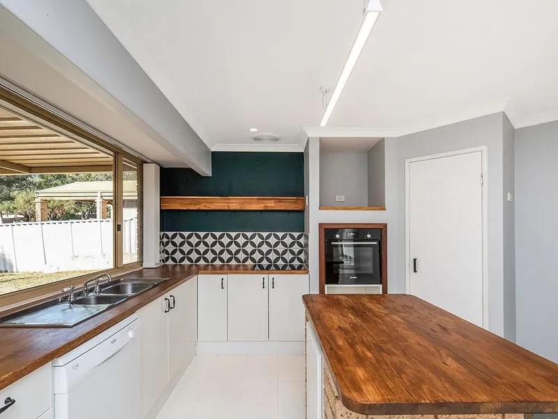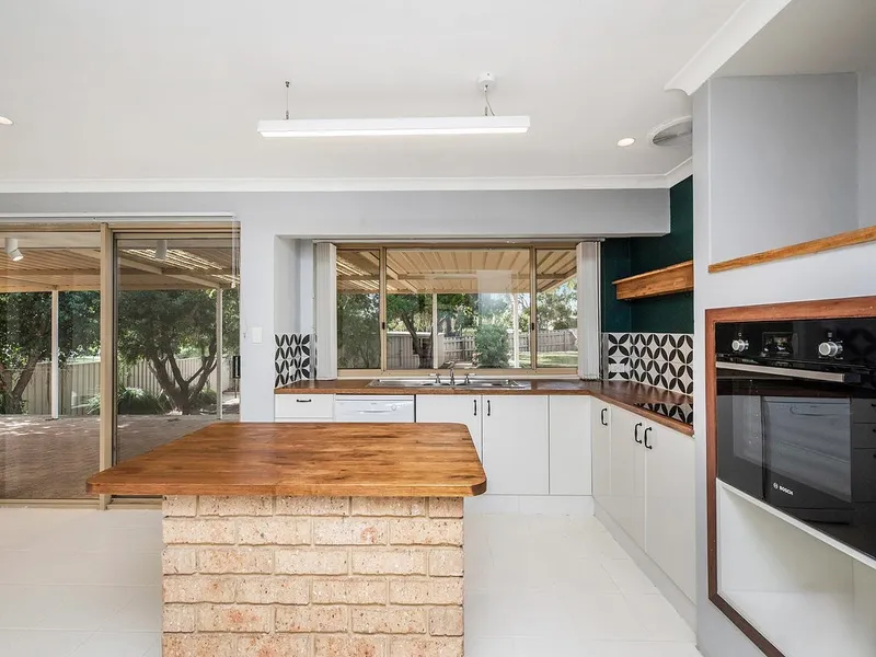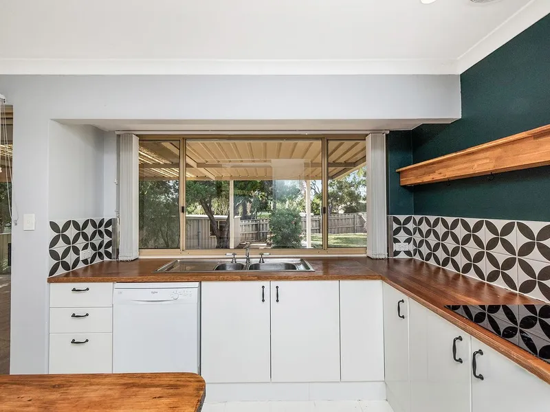 - Bright kitchen with timber benchtops, overlooking the backyard