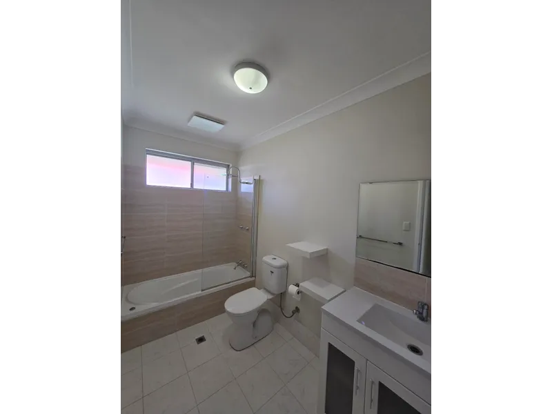 - Sleek renovated bathroom with shower over bath