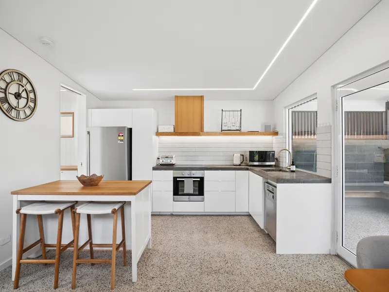 Separate laundry and bathroom are located off the kitchen area, with external access.