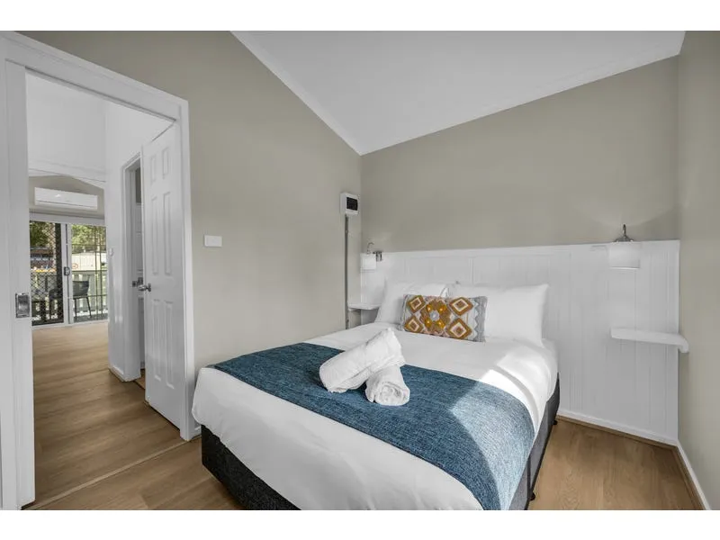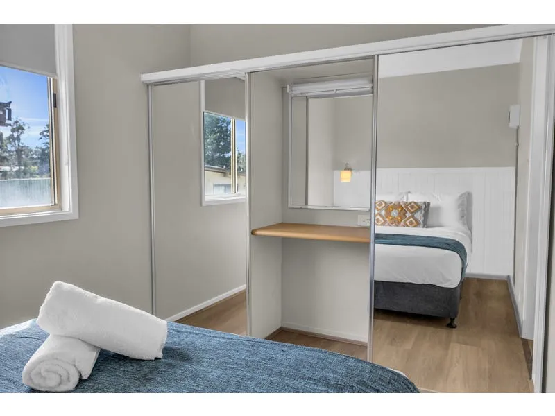 • Spacious bedroom with a double bed, built-in bedhead, bedside tables, and mirrored built-in wardrobes