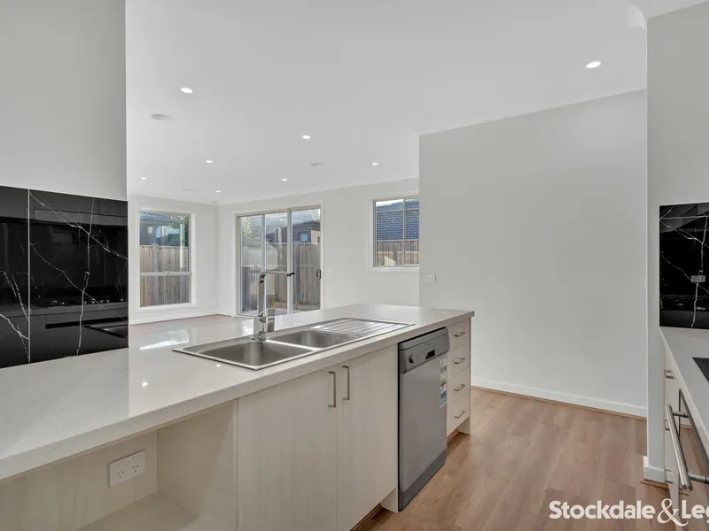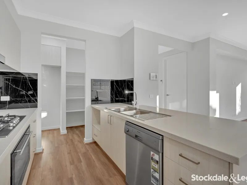 The rear of the home opens into a spacious open-plan kitchen, meals and living area finished with floorboards for easy care and maintenance. The kitchen features 900mm stainless steel appliances including a dishwasher, generous cabinetry, ample bench space and a walk-in pantry, making it ideal for everyday living and entertaining.