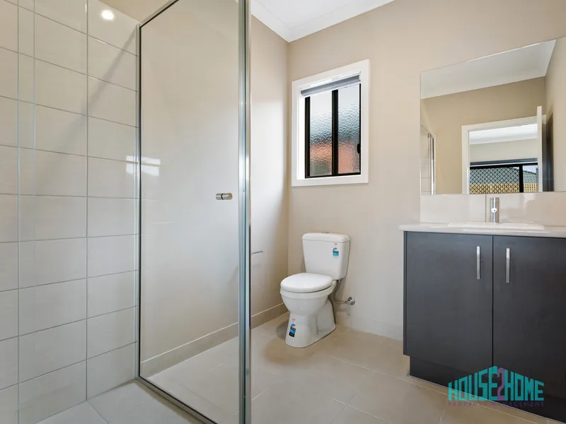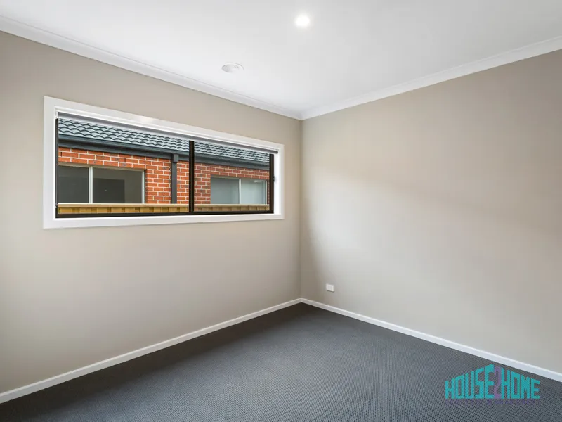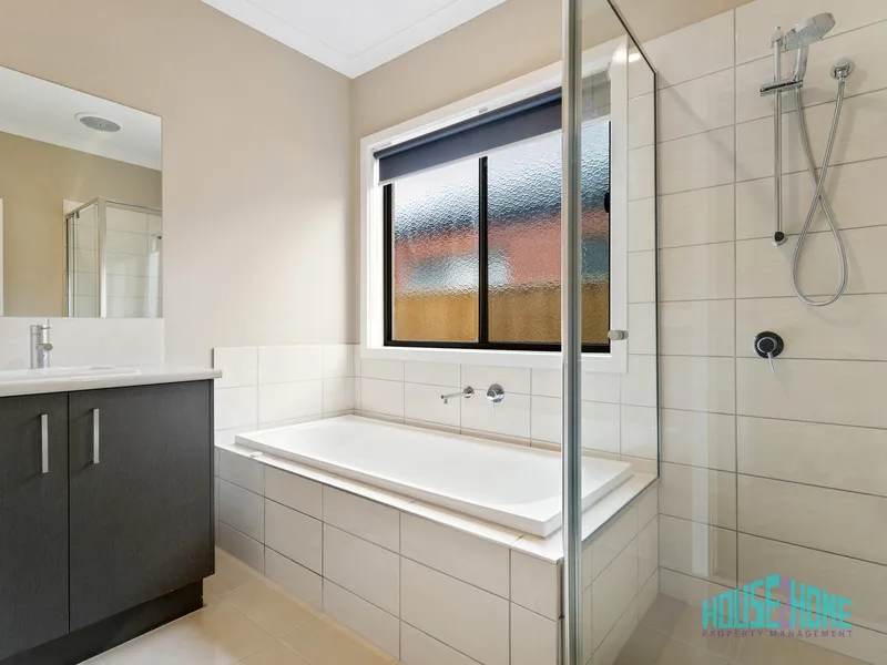 The master bedroom is positioned at the front of the property and enjoys plenty of natural light. It features plush wall-to-wall carpet and a generous walk-in robe with built-in cabinetry including shelving, drawers and both long and short hanging space. The adjoining ensuite includes quality cabinetry with ample storage, stylish tapware and fittings, and a tiled shower base for easy cleaning and maintenance.