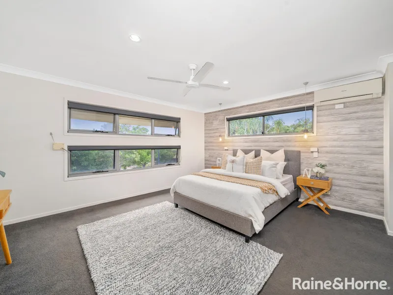 The master suite is a standout, featuring pendant lighting, two double built-in robes, split-system air conditioning, ceiling fan and a private ensuite with large shower, vanity and toilet.