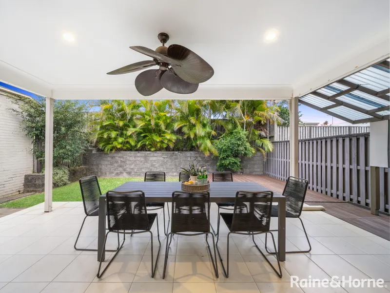 Sliding doors open to a covered outdoor entertaining area featuring a tiled patio and deck, complemented by a low-maintenance grassed yard.