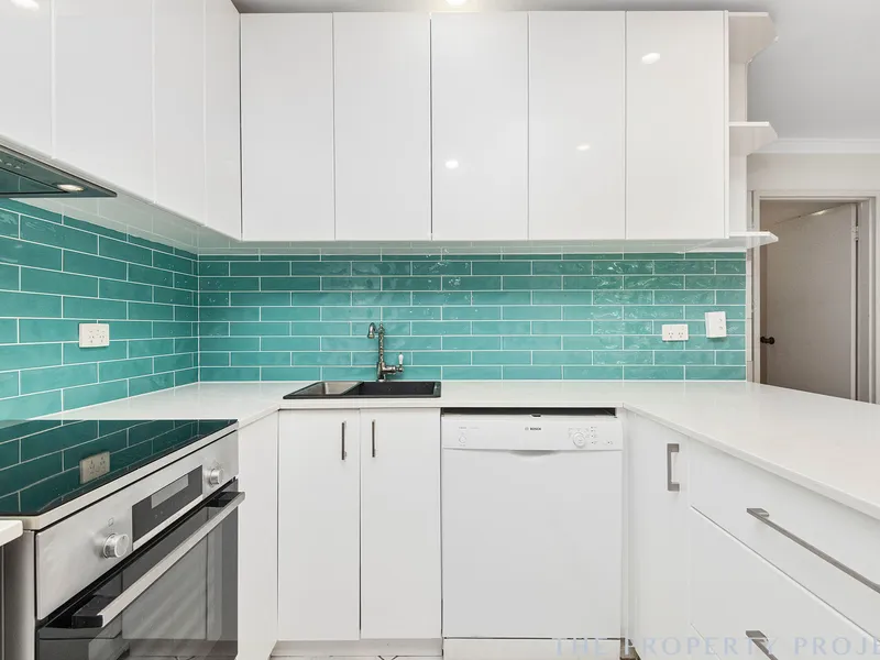 - Stunning near new kitchen with stone waterfall-edge benches, premium cooking appliances including a gas cooktop and a dishwasher