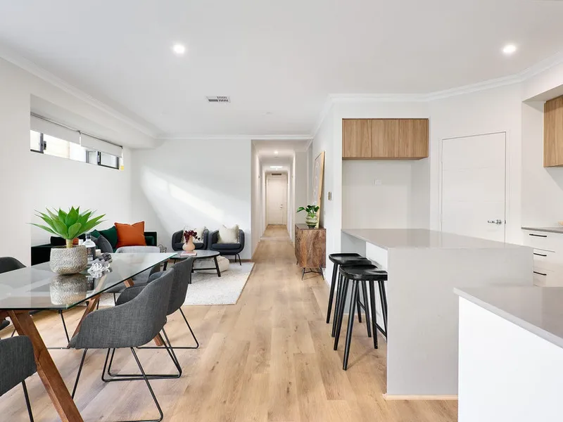 - Timber-look flooring, modern blinds, and high ceilings