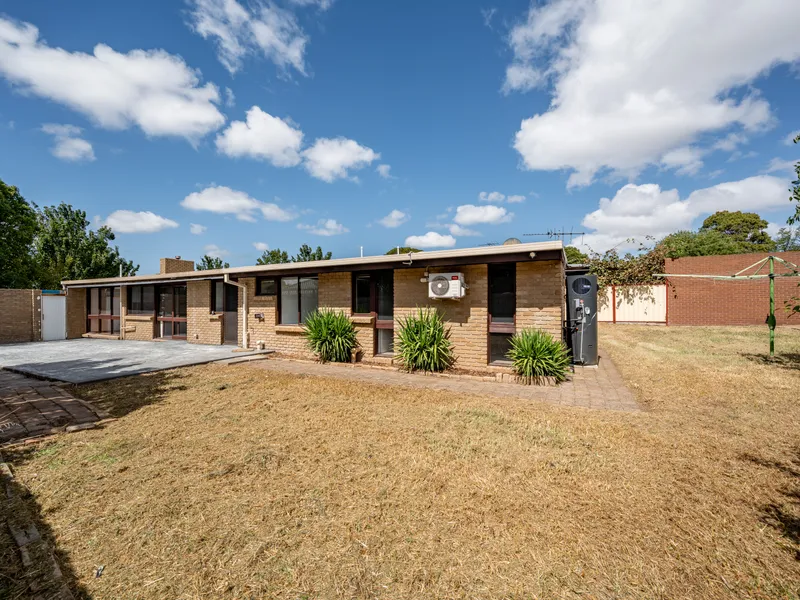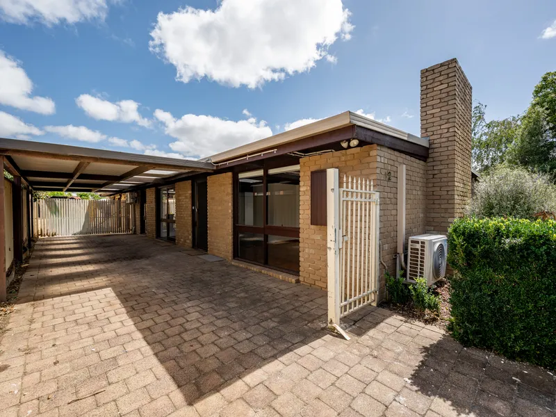 Practical features include a central tiled bathroom, separate laundry, double carport with drive-through access to the rear, and a garden shed. Climate control is provided by split system air conditioners, complemented by a wood heater.