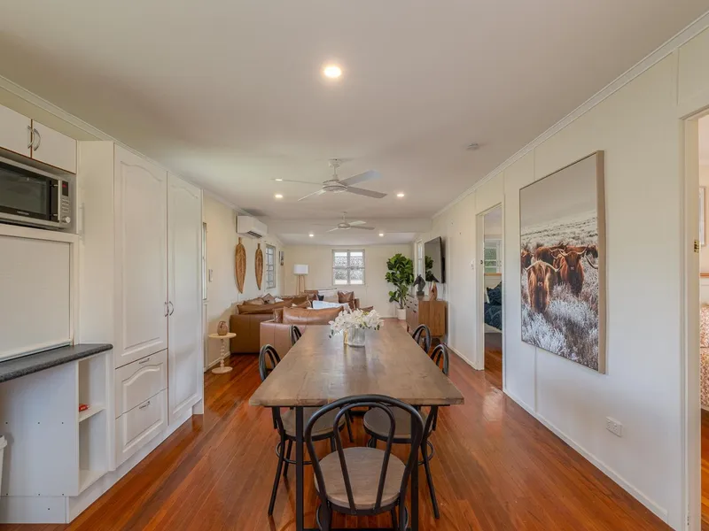 Large open plan living area of combined dining and lounge opening out onto a perfect north facing veranda.