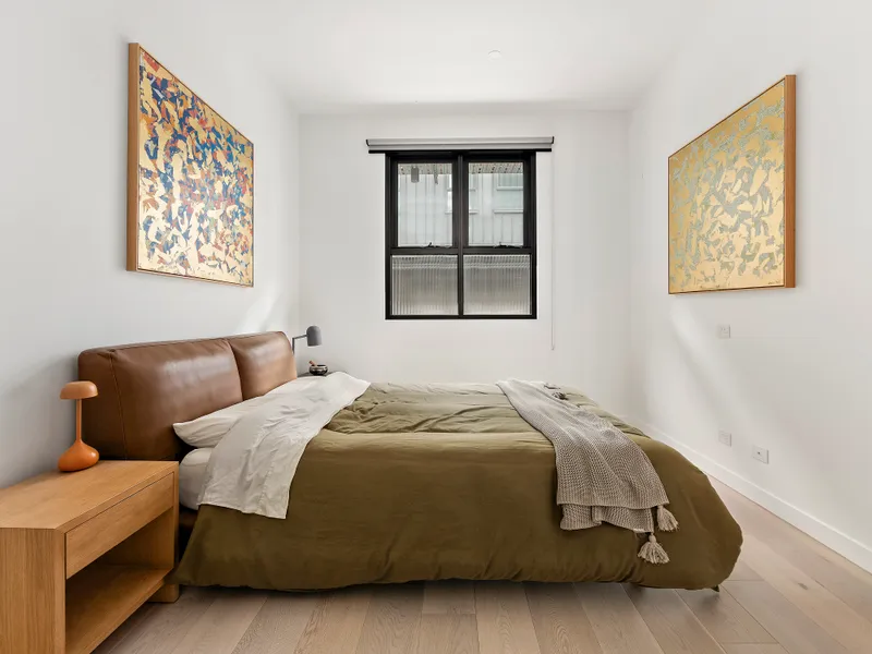 Beyond its impressively high ceilings, the as-new interior reveals two generous bedrooms with built-in robes, complemented by a sleek private ensuite and a central bathroom, both beautifully finished with floor-to-ceiling tiles. Bathed in natural light, the spacious open-plan living and dining domain offers versatility and comfort, anchored by a superbly appointed kitchen featuring a large moveable island bench, double dishwasher and premium Miele cooking appliances.
