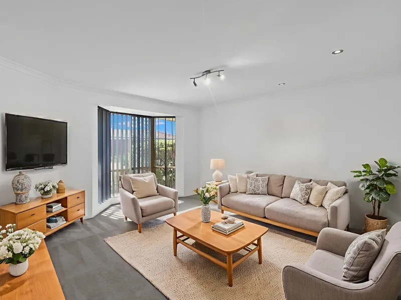 The star of the show is the stunning decked alfresco with gable pergola and roll-down blind - perfect for year-round entertaining. An easy-care courtyard with astro-turf and reticulated gardens makes life simple, while modern features throughout add comfort and style.