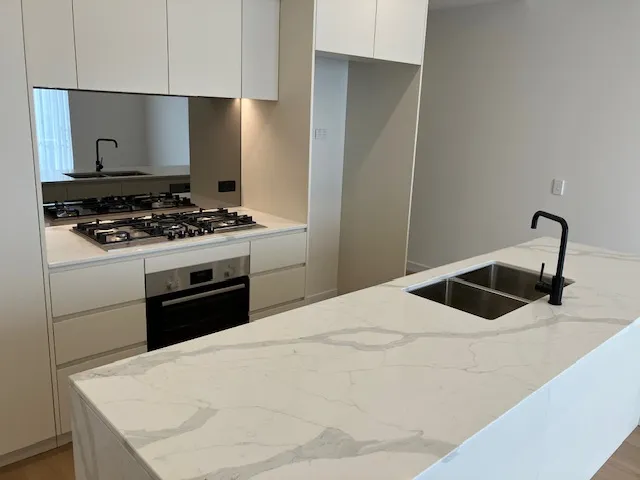 Three bedrooms also boast timber laminate flooring and window furnishings. They are serviced by a well-sized bathroom which vaunts a similar level of finish to the kitchen with matching stone and matt-white vanity unit cabinetry. Full-height tiles are a luxurious addition, while a semi-frameless shower opposes a frameless mirror.