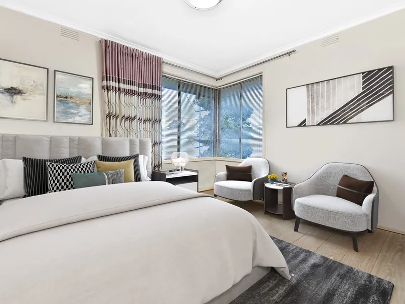 A covered portico protects the side-positioned entryway which leads through to a sunny, air-conditioned living room promoting timber-laminate flooring, high ceilings and large windows. Decorative retro pendant lighting is present and also found in the formal dining room.