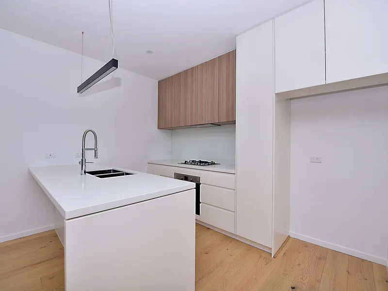 The modern kitchen blends style and function, featuring stone benchtops, a breakfast bar, pendant lighting, an oven with gas cooktop, rangehood, soft-close cabinetry, dishwasher and ample storage.