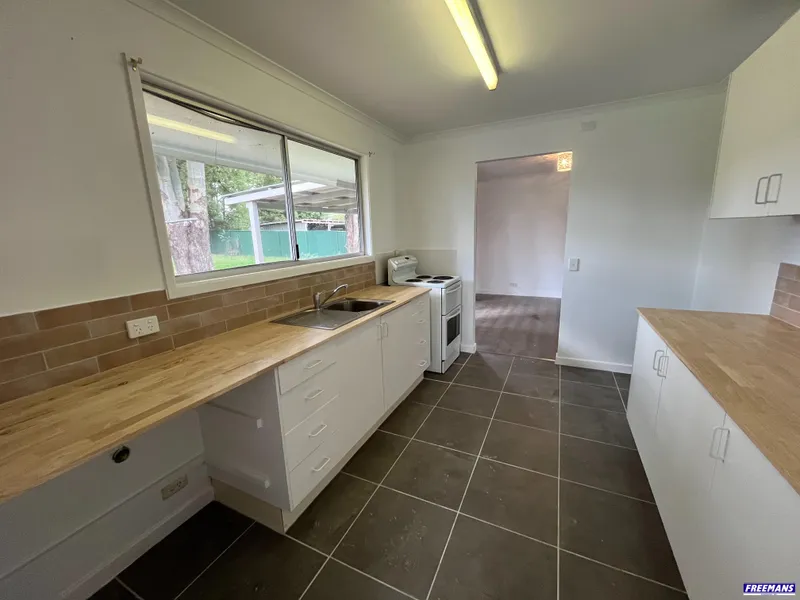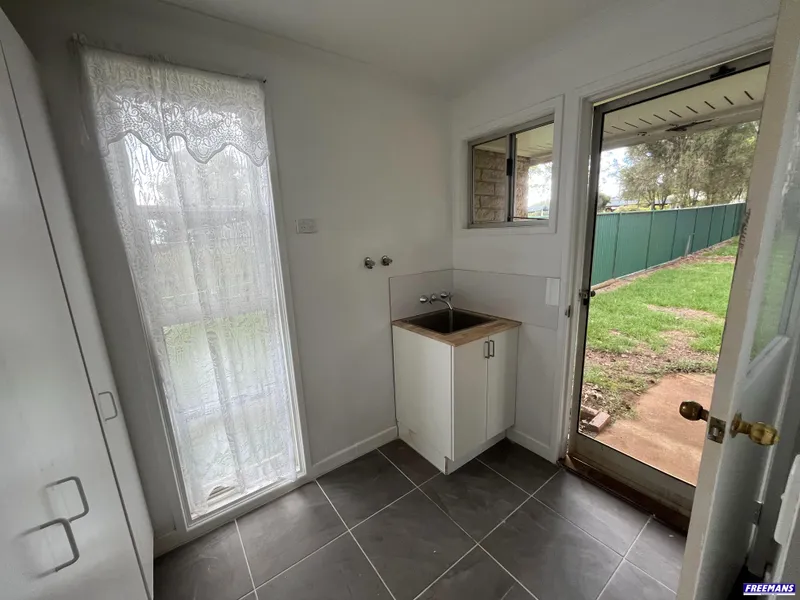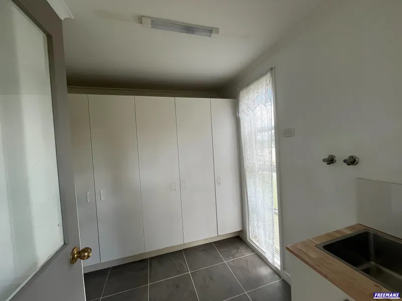 The large galley-style kitchen has been freshly refurbished and features an abundance of storage and bench space, an electric stove, and excellent natural light. The adjoining laundry is conveniently positioned and partially separated to create a practical and cohesive workspace.