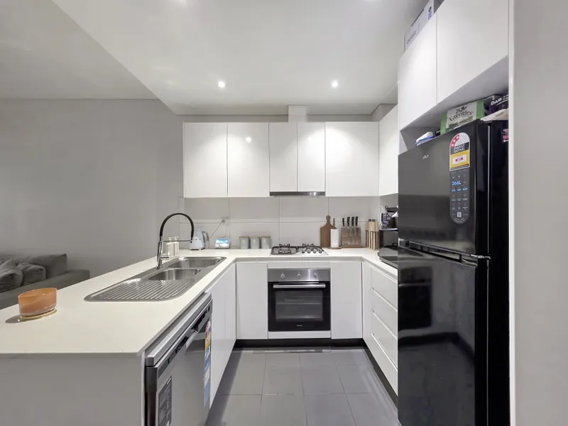 Modern kitchen with stone bench tops, electric cook top, microwave & fridge included