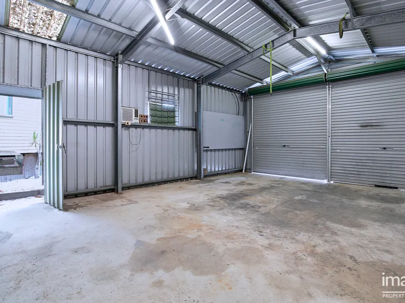 - Double-bay shed with enclosed carport and side access