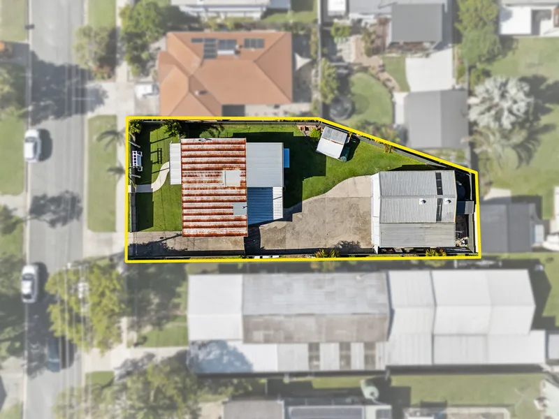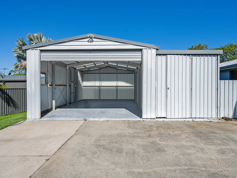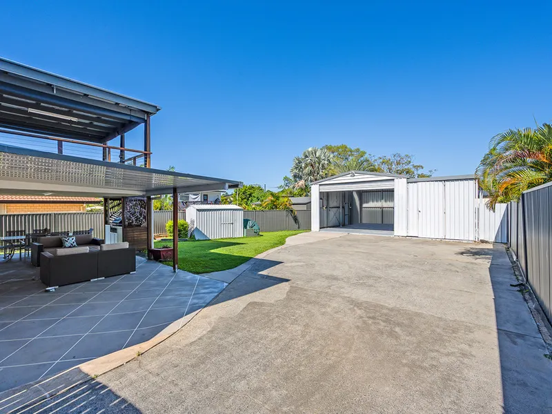 The expansive block includes side access to a double-bay shed with enclosed carport and an additional garden shed, providing ample space for vehicles, tools, hobbies, or extra storage.