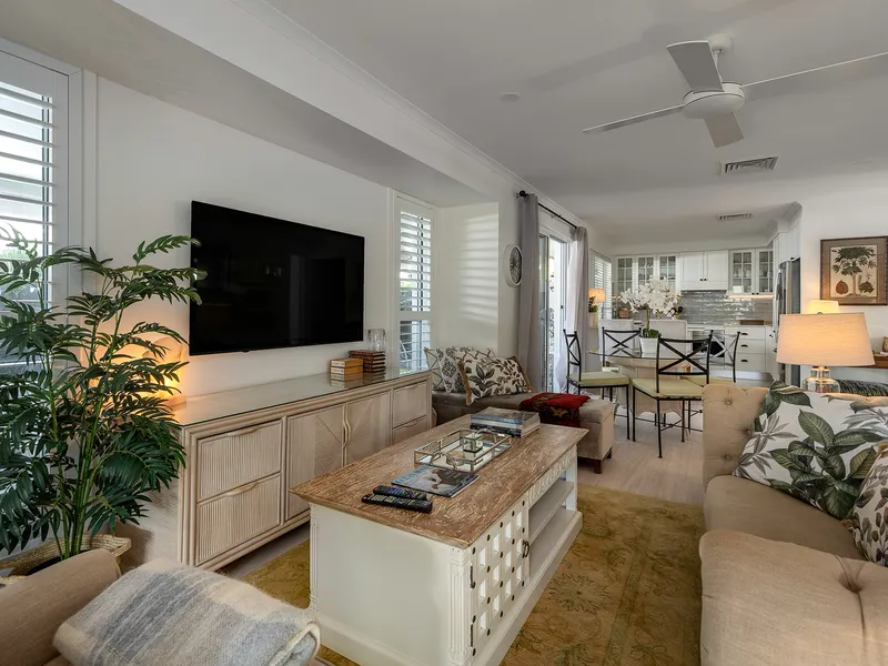 The coastal chic designer interior elevates the decor far above the generic average. Artwork, vases brimming with blooms, quality furniture and floor to ceiling patio glass doors that let the outdoors flood in, imbue the space with a light airiness.