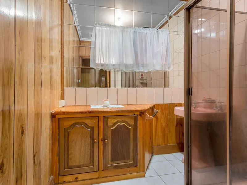The home features three bedrooms and a central bathroom, with an open plan living, dining, and kitchen area, a sunroom and a separate powder room. Outside, the generous backyard includes a garage and storage space, while the front provides multiple off street parking options.