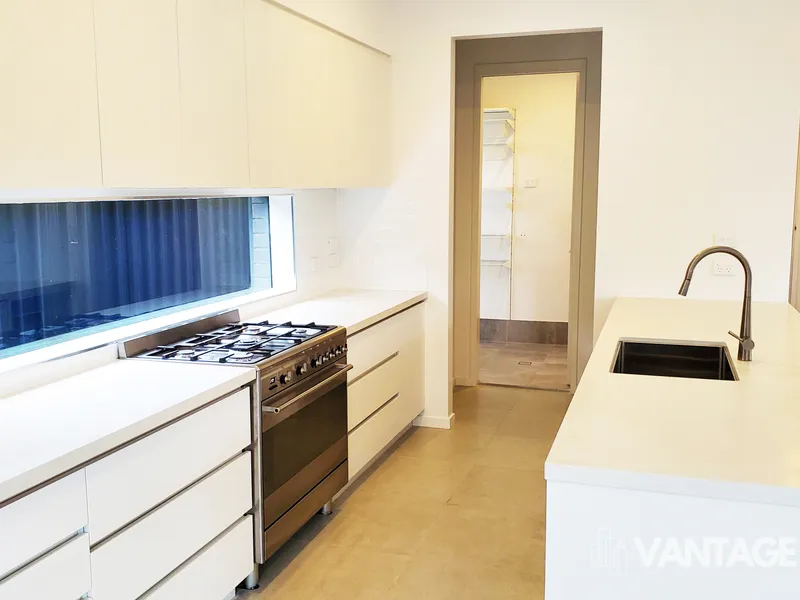 • Large modern stone benchtop kitchen with stainless steel appliances, gas cooking and dishwasher with walking pantry.