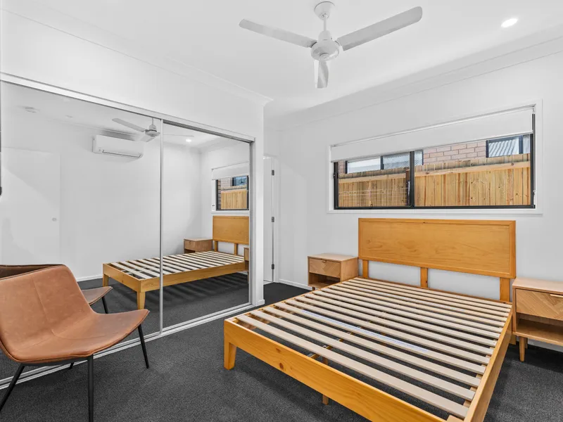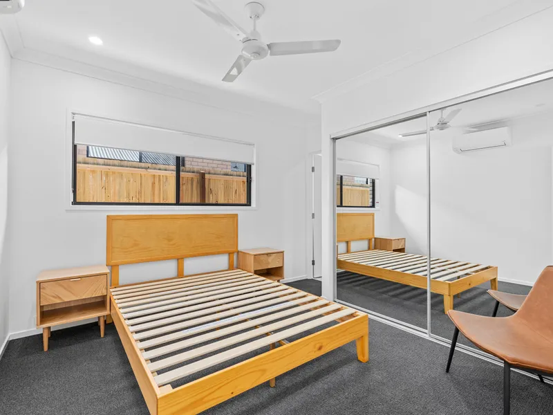 • Spacious furnished bedroom with queen bed (mattress not included), 2 bedside tables, wall-mounted TV, built-in wardrobes, air conditioning, and ceiling fan
