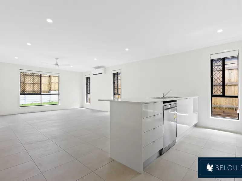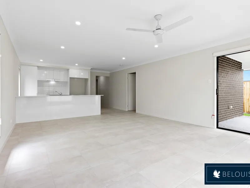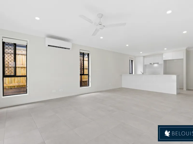 - Open plan kitchen, dining, and family room with air-conditioning and a ceiling fan