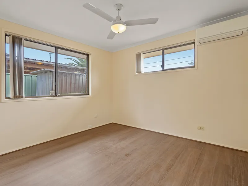 The kitchen is neat and functional, complete with a wall oven, grill, electric cooktop, and plenty of natural light. Down the hallway, the bedrooms are well-sized with built-in robes and ceiling fans, with the main bedroom also featuring air conditioning. The layout is practical and family-friendly offering an internal laundry, bathroom with separate bath and large fully fenced yard.