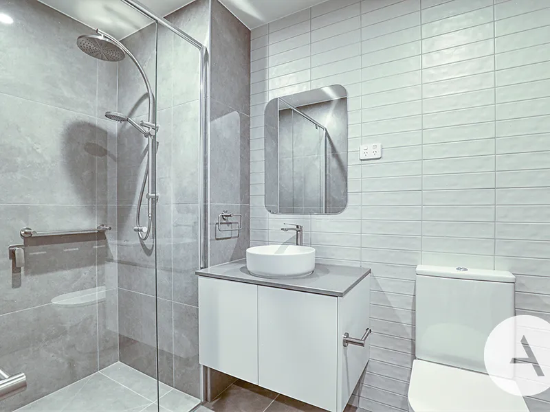 The designer touch is evident throughout, with high-quality fittings and finishes creating a sleek, contemporary feel. The modern bathroom features full-height tiling, a semi-frameless glass shower screen, stone-topped vanity, and elegant tapware, delivering both style and functionality.