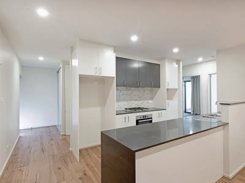 The heart of the home is the designer kitchen, featuring extensive cabinetry, quality appliances, generous bench space and a statement island ideal for entertaining. The open-plan living and dining areas are framed by large windows and sliding doors, seamlessly connecting indoors to the expansive covered deck with views over Lyneham wetland.