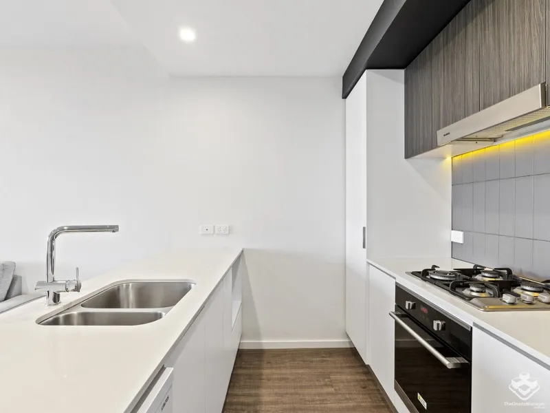 The modern kitchen comes fully equipped with a gas cooktop, oven, dishwasher and microwave space, along with ample cupboard and drawer storage.