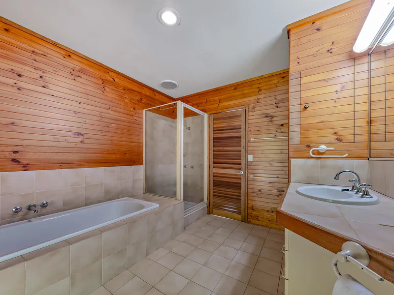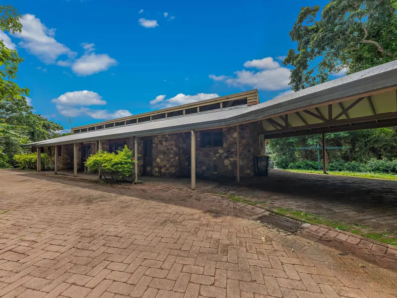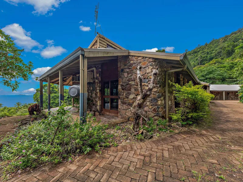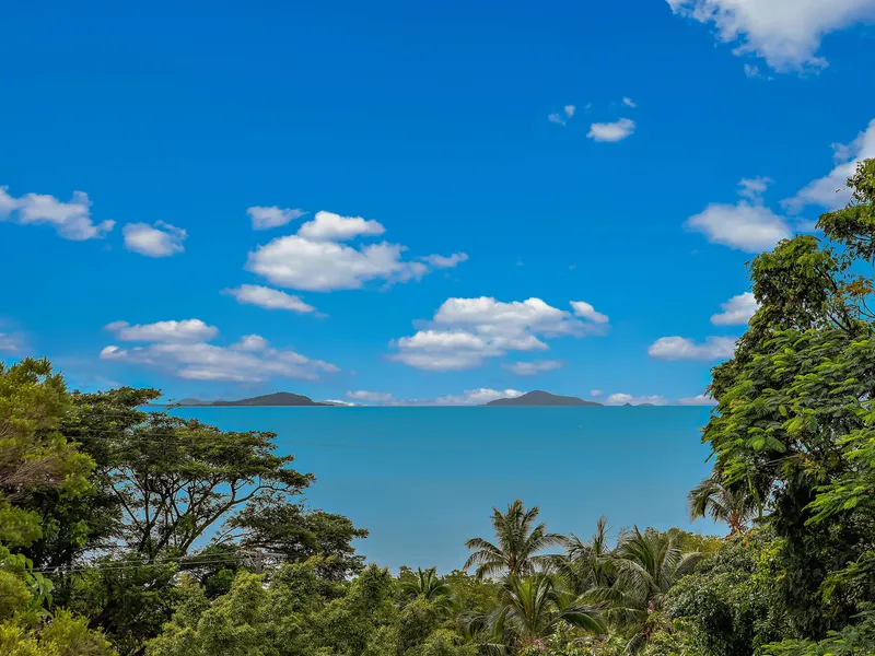 Double covered carport and set high on a hill with northerly aspect across the bay to Airlie Beach and the Whitsunday Islands.