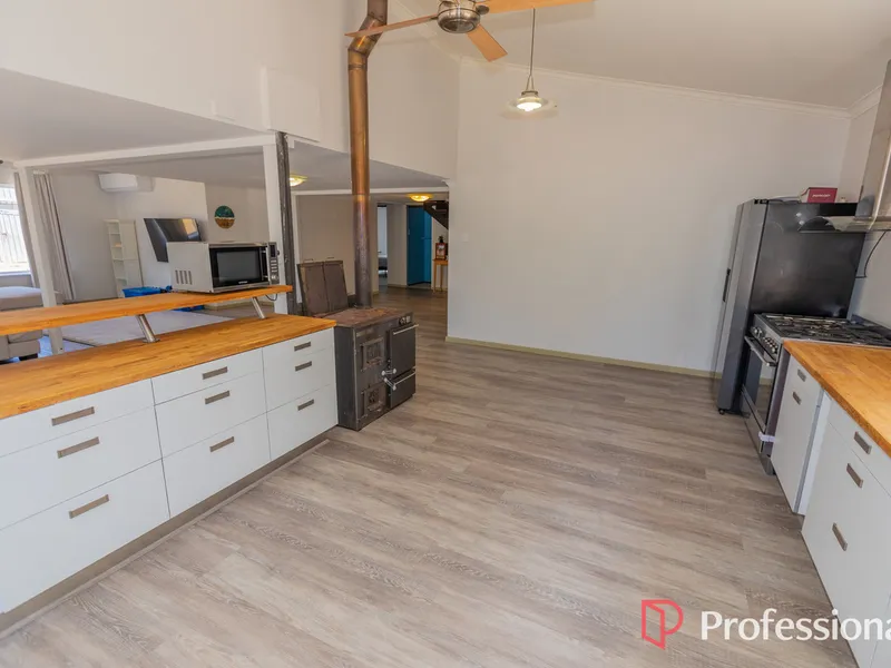 Downstairs everything is oversized!! The home has fantastic open living with adjoining kitchen that is well equipped with stainless steel 900mm gas cooking with range hood, in addition to a Thermalux wood stove, walk in pantry and double sink. Great bench and cupboard space for you to cook up a storm.