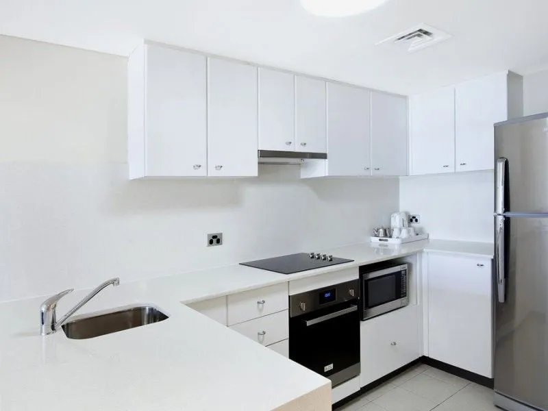 Full-size kitchen with Caesar Stone benchtop, microwave, dishwasher and 360 Ltr fridge.