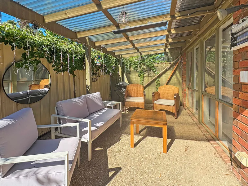 The property features three spacious bedrooms, each with built-in wardrobes. The master bedroom includes its own air conditioner for added comfort, while the light-filled living area is equipped with a split system air conditioner and Euro fireplace, ensuring year-round climate control.