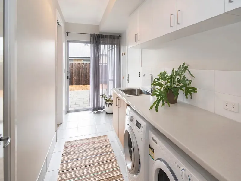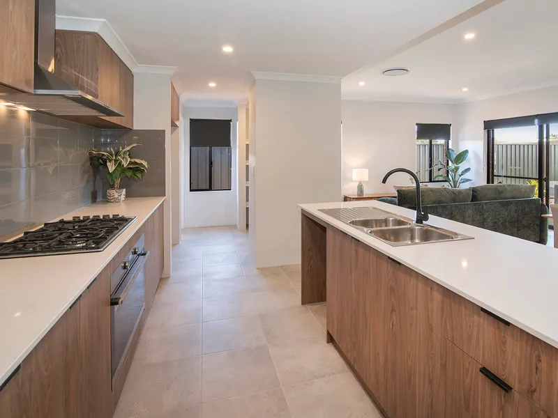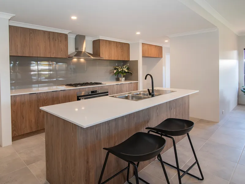 The kitchen sits at the heart of the home, featuring a stunning Marri timber island bench, stone benchtops surrounding the 900mm oven and sink, and a neatly tucked away butler’s pantry.