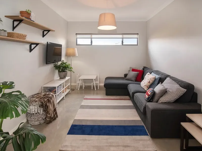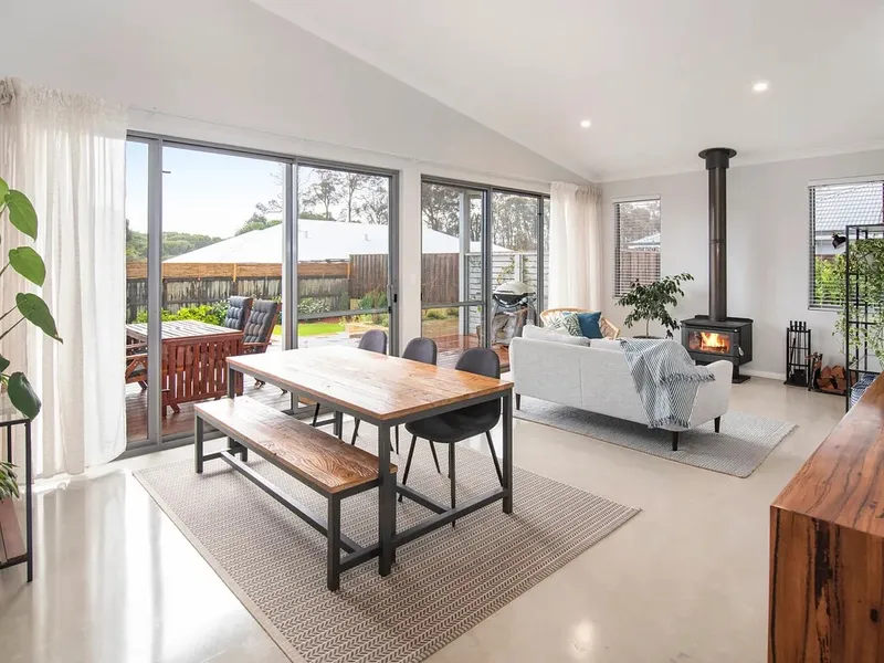 The open plan living area is generous and welcoming, with high ceilings, polished concrete floors and a fireplace creating warmth through the cooler months. North-facing windows bring in natural light throughout the day, enhancing the sense of space and connection to the outdoors.