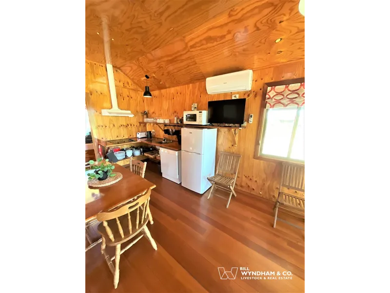 The furnished cottage features a queen-sized bed in one room and two sets of sturdy, built-in bunks in the second. Reverse cycle air conditioning and wood heater provides year-round comfort. The kitchen features a dishwasher, electric cooktop, and air fryer.
