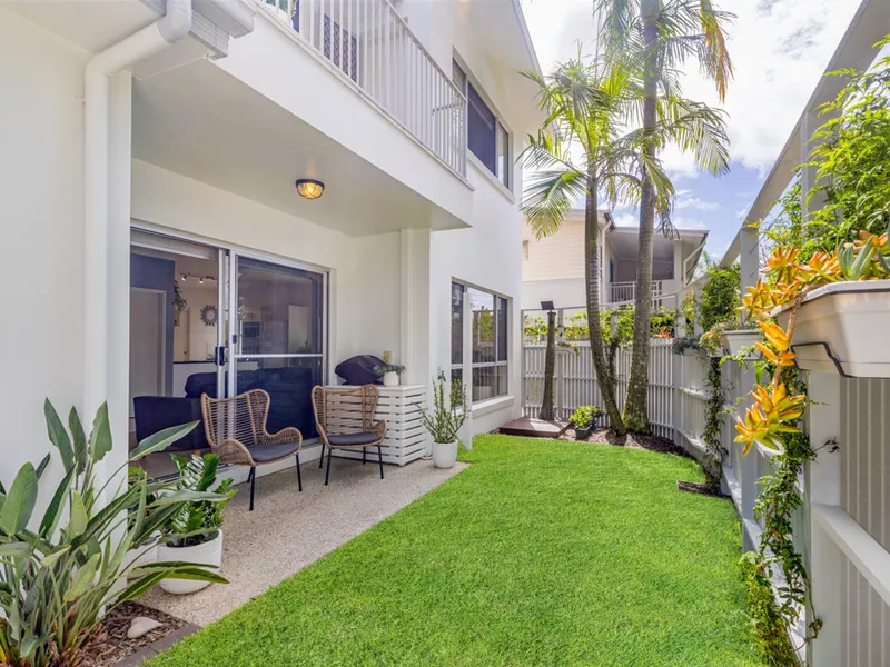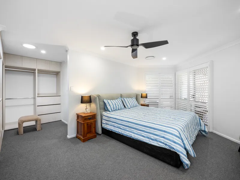 The open plan living and dining area flows effortlessly to the outdoor entertaining space, capturing stunning canal views and inviting in natural light and breezes. The well-appointed kitchen sits at the heart of the home, complete with stone benchtops, quality appliances and a large island bench, making it perfect for both everyday living and entertaining.