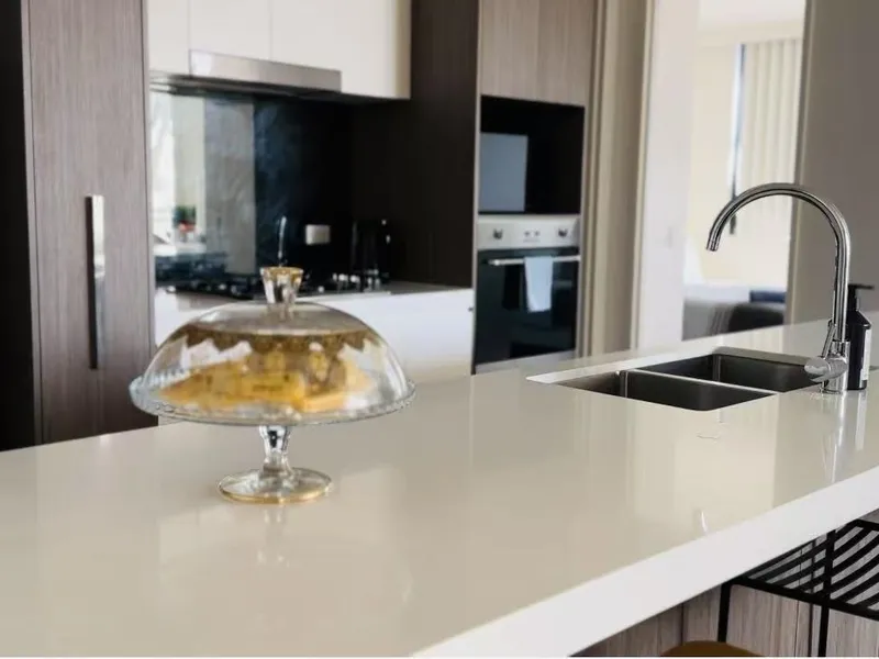 - Modern kitchen with stone bench top, gas cooking & stainless steel appliances
