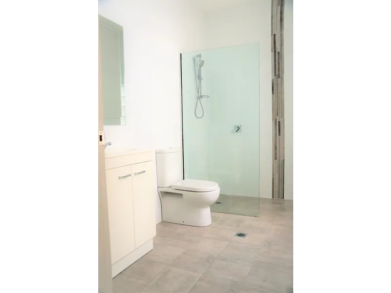 • Designer bathroom featuring glass shower screen, recessed lighting, and mirrored shaving cabinet.