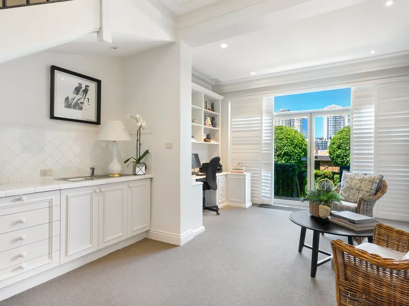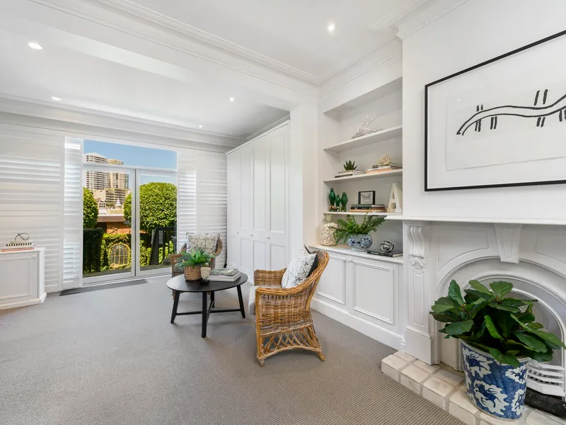 Celebrating magical views from all three levels, the ever-changing harbour spectacular is superbly framed by two oversized picture windows. Stylishly customised with endless storage options, bespoke joinery houses the gas fireplace in the open plan living room. Versatile in its configuration, the dining room is sure to impress with its postcard iconic views. United in polished hardwood timber flooring, high ceilings are outlined by detailed cornicing encasing the terrace style layout. Inter-connecting multi-purpose rooms on the garden level offer immense flexibility, they are currently utilised as an open guest room, additional lounge room with wet bar and home office. Formally landscaped, the hedge framed stone courtyard is ideal for relaxation, pets or barbequing.