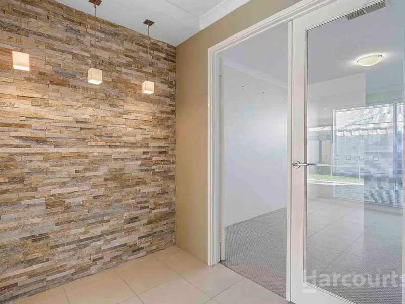 A double door entry welcomes you into this delightful home with a generous tiled entrance and stone feature wall.