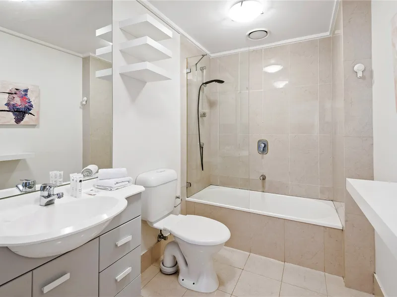 The generous bedroom enjoys an abundance of natural light, complemented by built-in robes and a stylish bathroom with a shower-over-bath and a dryer included for added convenience.