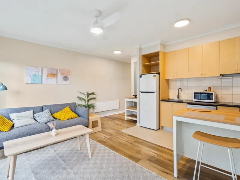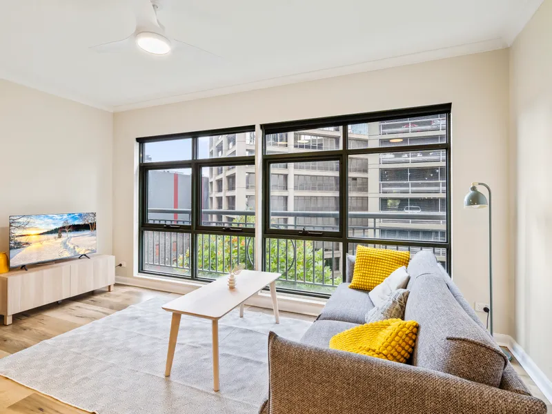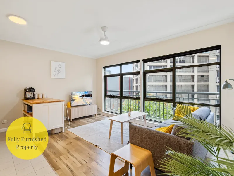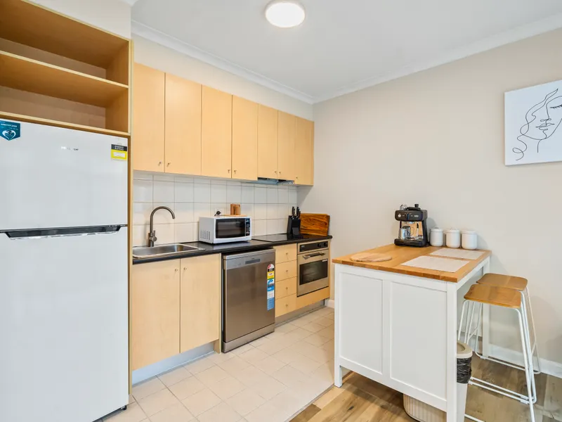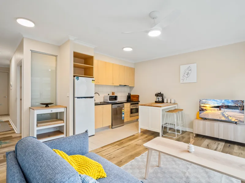The thoughtful layout feels bright and airy thanks to its neutral color tones. Anchored by a smart and adaptable kitchen, the generous kitchen/living/dining zone has north-facing windows, allowing plenty of natural light. The spacious bedroom features large built-in robes, and the apartment is complemented by brand-new, stylish furniture for a fresh and modern feel.