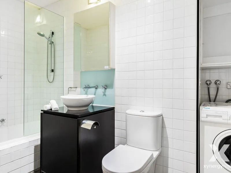 The light-filled open-plan living and dining area features floor-to-ceiling glass doors that open onto a private balcony. The kitchen is neatly finished and functional, complete with stone benchtops, quality cooking appliances, and ample cupboard space for everyday storage. The carpeted bedroom includes mirrored built-in robes and connects directly to a semi-ensuite, two-way bathroom with floor-to-ceiling tiles and a shower over bath. A European-style laundry is conveniently incorporated into the layout.