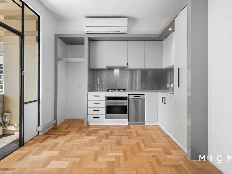 The apartment features a light-filled open-plan living and dining area that flows to the contemporary kitchen which is fitted with quality appliances including a dishwasher, gas cooktop and sleek stone finishes, complemented by ample storage and functional design.