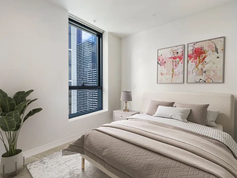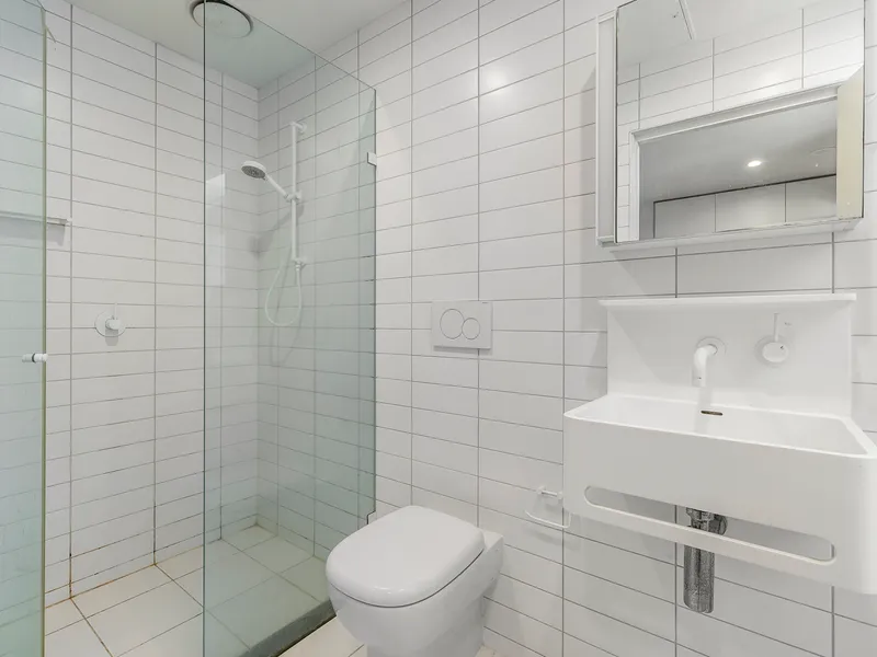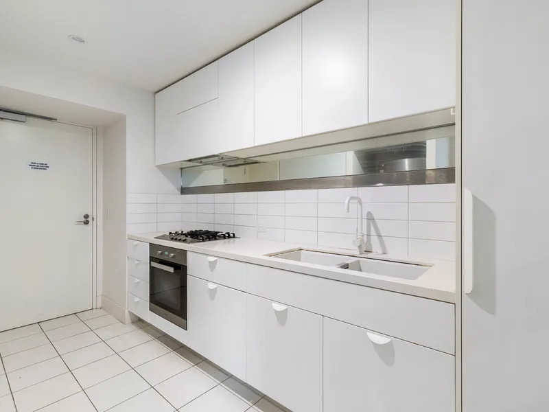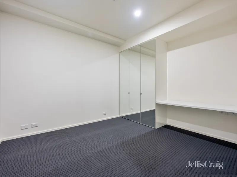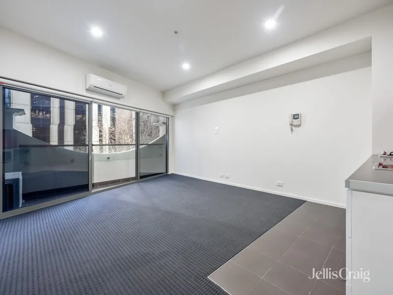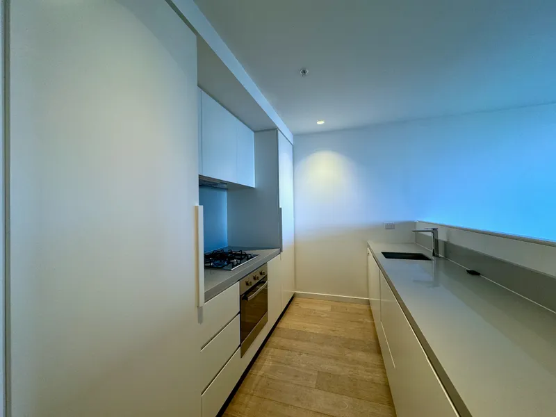 Situated on the 18th floor of Vision Apartments, this smartly designed two-bedroom, two-bathroom residence offers elevated living in the heart of Melbourne. The living area, framed by floor-to-ceiling windows, is flooded with natural light and opens onto a private balcony with cityscape views.