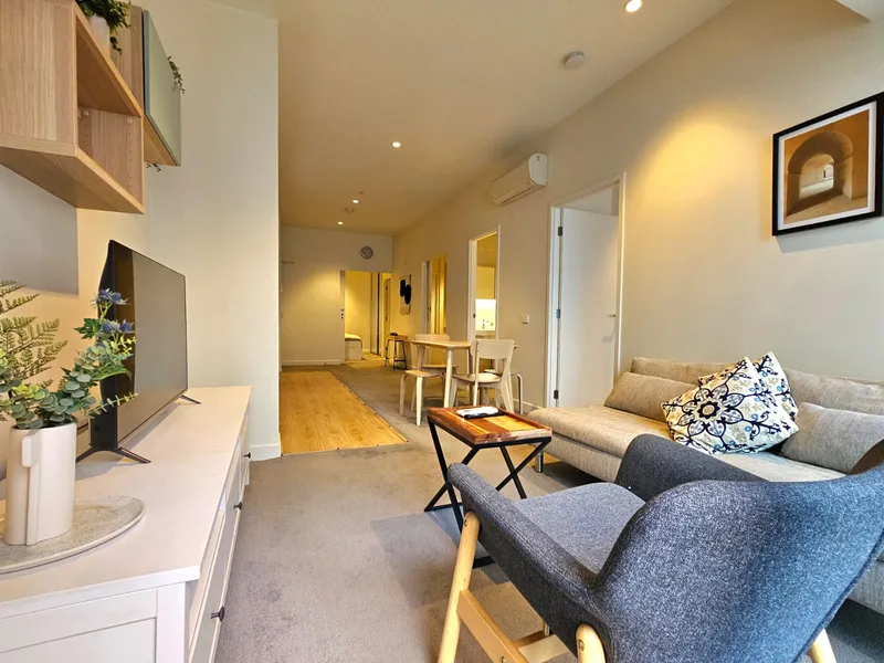 The apartment features well-appointed carpeted bedrooms with built-in robes, a fully equipped kitchen fitted with stainless steel appliances, and a spacious open-plan living and dining area designed for modern city living. Additional features include an intercom security entry, European laundry, double-glazed windows and sliding doors for enhanced comfort and noise reduction, as well as LED downlights and roller blinds throughout.