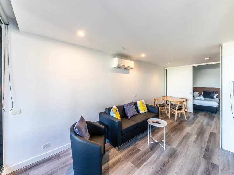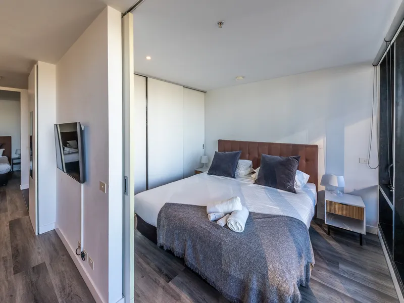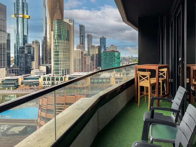 Perched high on Level 21, this 2 bedroom 1 bathroom apartment ("Aura Apartments") features a large balcony taking in sweeping views of the Yarra River to the MCG, city skylines, and is with top attractions right on your doorstep – all within minutes walking to Southern Cross Station, Crown Casino, Melbourne Convention and Exhibition Centre, and Marvel Stadium.